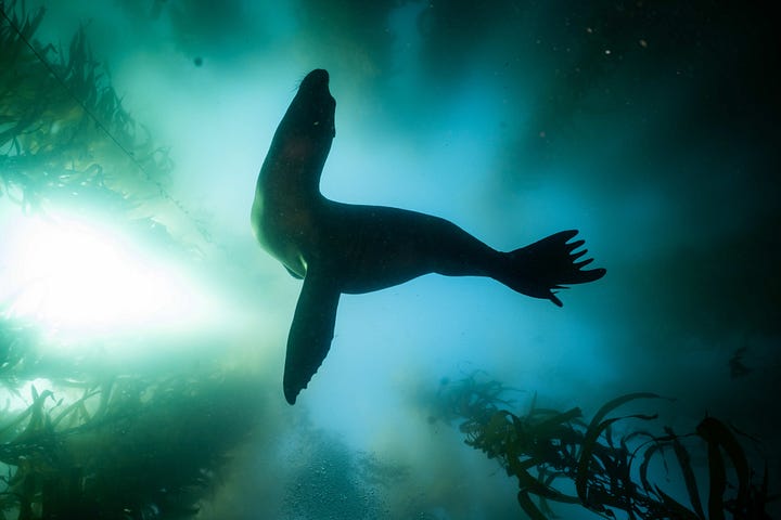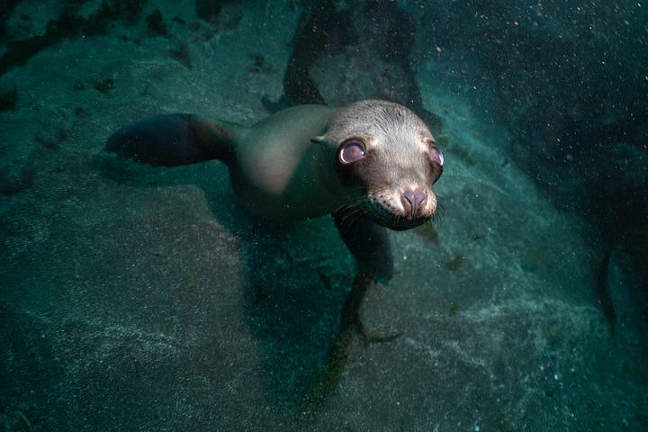 We anchored and dove just offshore from a known sea lion rookery, and from the boat we could hear their barking, though we couldn’t see them through the fog. Once in the water, we became a welcome diversion for the juveniles, who swarmed around us clumsy, slow swimmers with funny suits and blowing bubbles. They were playful, inquisitive, and graceful, swooping just past the camera, nipping at our fins, snapping their jaws, and following us everywhere we went, in and out of the lush kelp forest. Forget about looking for other species, the sea lions demanded attention, and it was a thrill to interact with them. As I’ve written before, I always marvel at how diving allows such close interaction with so many wild animals, an experience that, on dry land, seldom happens.